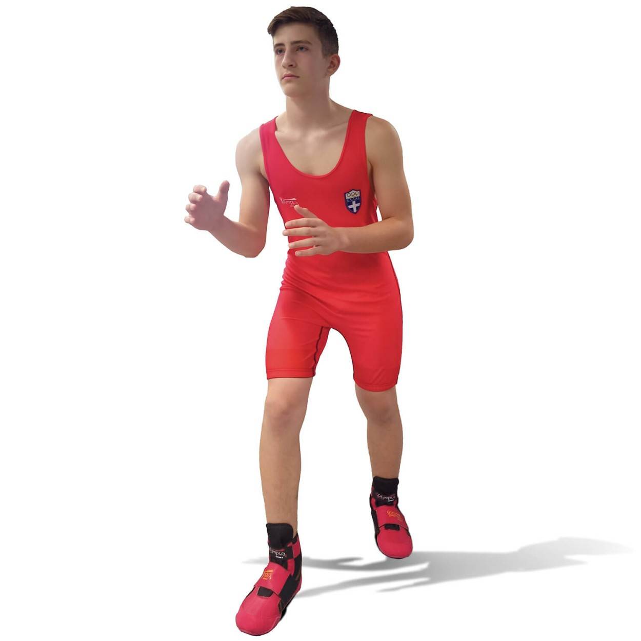 Μονόχρωμο παλαιστικό μαγιό Olympus για αγώνες με το GRE στην πλάτη και το εθνόσημο στην καρδία.